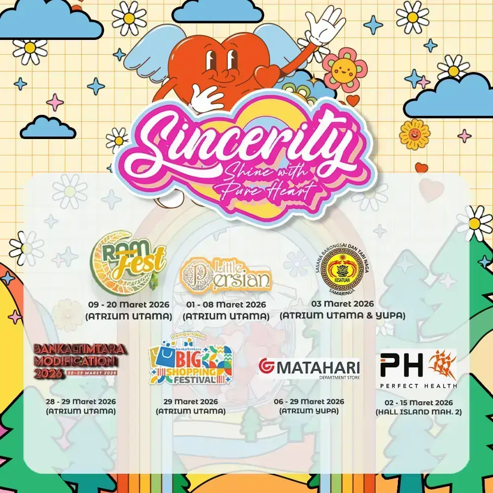 BIG Mall Samarinda kembali mengeluarkan Calendar of Event (CoE) di bulan Maret 2026. Kali ini, untuk temanya adalah Sincerity : Shine with Pure Heart, akan ada event seru dan menghibur yang akan hadir di bulan Maret ini. Yuk simak daftar eventnya serta pop-up booth di bawah ini;
